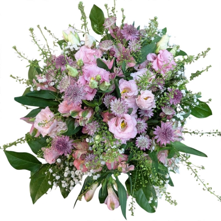Locker gebundener Wiesenstrauß in soften Rosatönen. Lisianthus, Sterndolde und Inkalilie treffen auf feines Beiwerk und sattes Grün. Die Wirkung: leicht, natürlich, zeitlos.