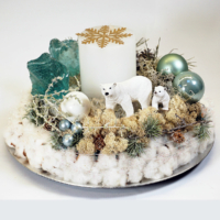 Gestaltet auf einer Naturkranzunterlage mit echtem Hirschgeweih, Hirsch und Sternen, verschiedenen grünen bis braunen Weihnachtskugeln sowie Glaszapfen, abgerundet mit künstlichen Fellstücken und rot-grünem echten Efeu.