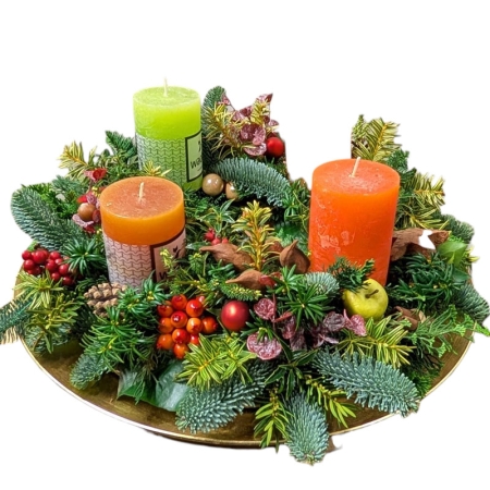 Adventskranz natürlich, in Mossi gesteckt mit roten Kerzen